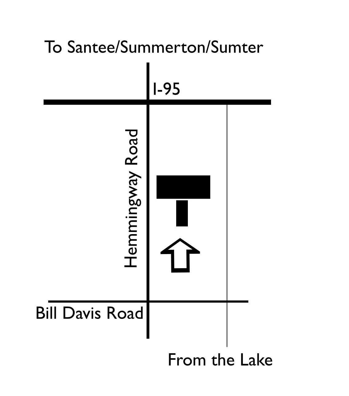 Leaving the lake, this sign is on Hemmingway Road approaching I-95/ Summerton/Santee/Sumter. The sign is 8 feet tall by 16 feet wide and is read on the right by travelers travelling from the lake toward I-95.